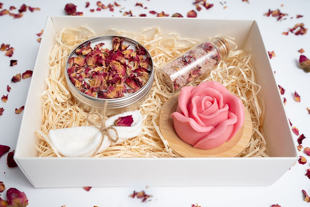 This luxury gift set box is the perfect present for someone special. The set includes a handmade rose soap and a scented soy wax candle, both of which are made with natural ingredients. The soap is gentle on the skin and can help to moisturiser and nourish the skin, while the candle can provide a relaxing and calming atmosphere The set is packed in an eco-friendly white box with a ribbon, making it a sustainable and stylish option for gift-giving. The eco-friendly packaging is made from sustainable materials and can be reused or recycled, making it a responsible choice for those who care about the environment.